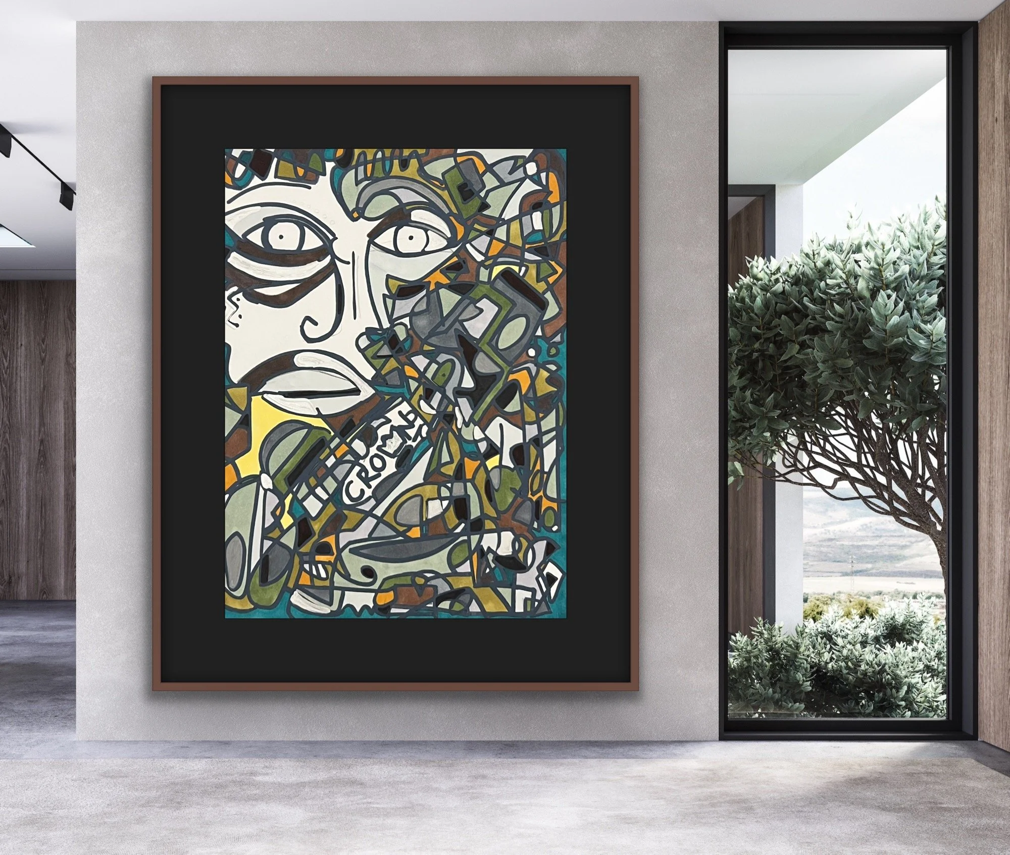 Signature Elements— Metallic accents, bold linework, abstract faces, layered textures, and rhythmic geometry.